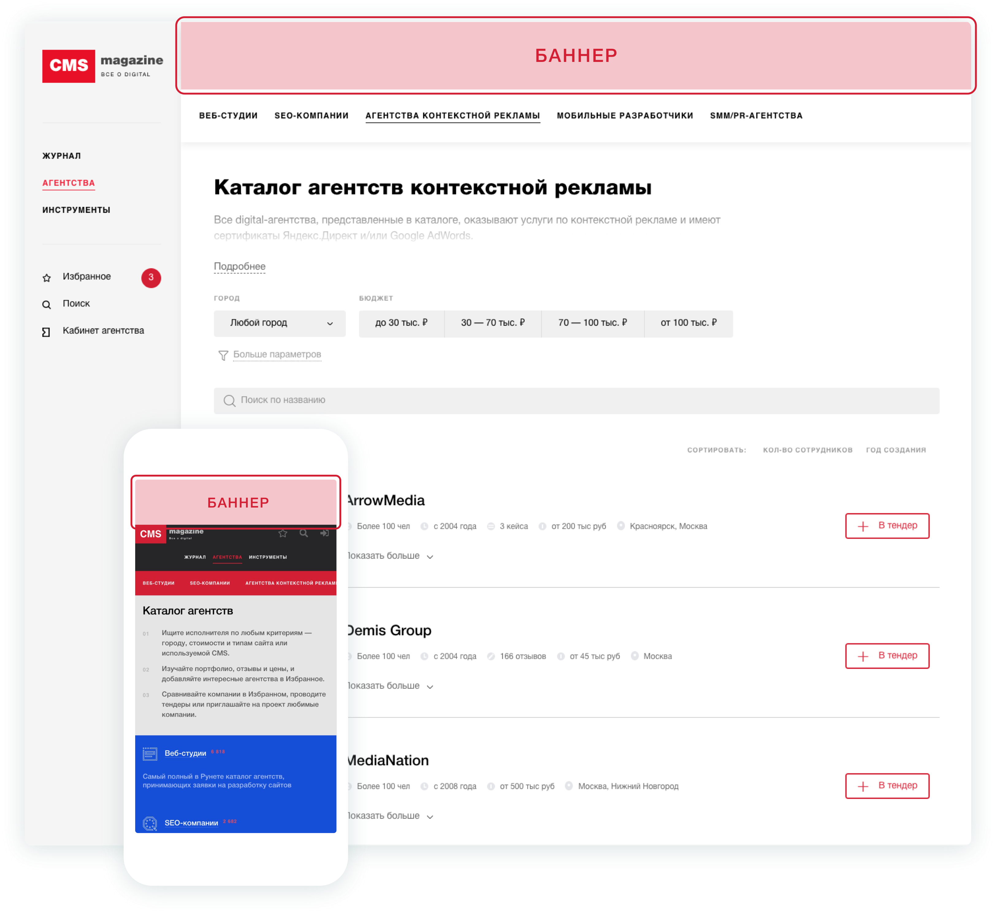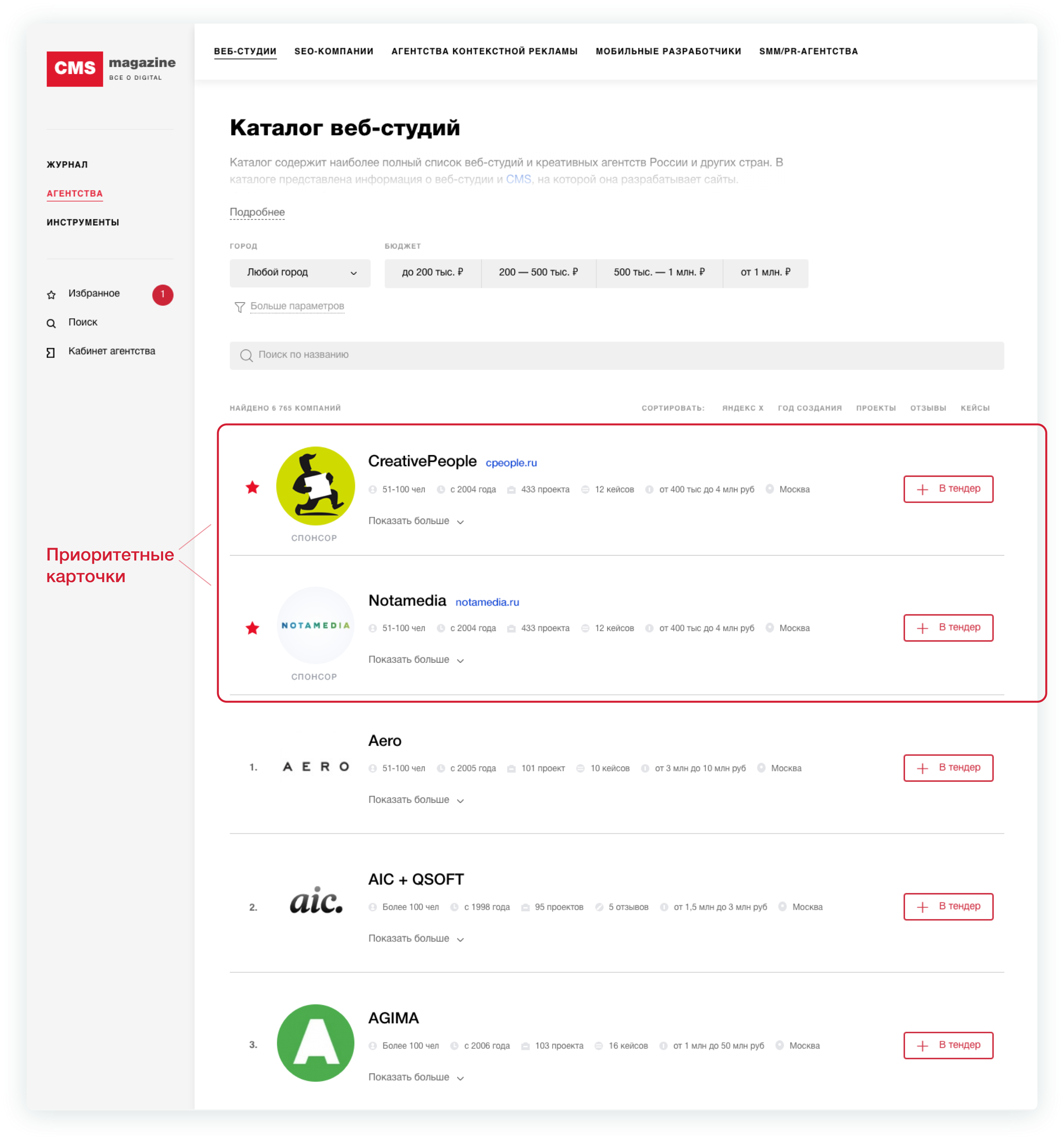 Формат представляет собой дублирование карточек компаний и размещение дублей вверху каталогов в соответствии с заданными критериями фильтрации. При дублировании в карточку добавляется прямая ссылка на сайт агентства и надпись: Спонсор. Расположение дублированной карточки зависит от расположения в каталоге.