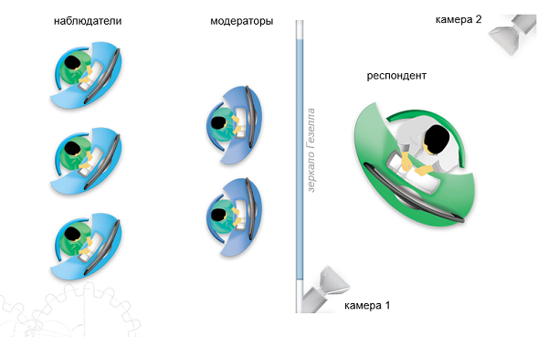 Но возможно тестирование, при котором модератор находится рядом с респондентом. В этом случае модератор еще сильнее старается не оказывать влияние на действия респондента, и даже на схеме (см. ниже) показано, что он сидит практически вне поля зрения респондента, как бы за его спиной: