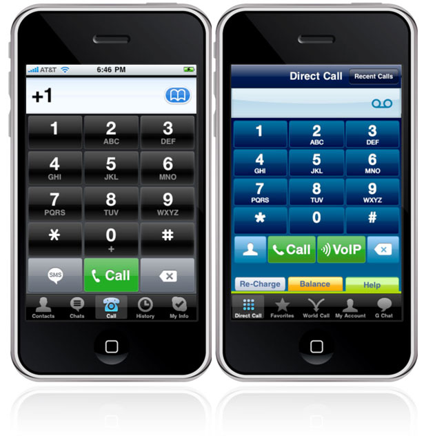 Что отличает эти приложения, так это нижняя часть экрана. В обоих приложениях кнопки располагаются прямо над вкладками панели навигации, что, как уже обсуждалось выше, далеко не лучший выход. Однако благодаря крупному размеру кнопок в Skype (слева), проблема кажется не такой значительной. В Call Global App кнопки, вплотную прилегающие к верхней границе панели, слишком тонкие, и их тесное прилегание делает вероятными ошибки. Хотя технически их размеры превышают минимальные 44×30, нехватка пространства между кнопками и провоцирующее ошибки расположение создают неудобства. Такая разметка требует более крупных кнопок или более свободного расположения.