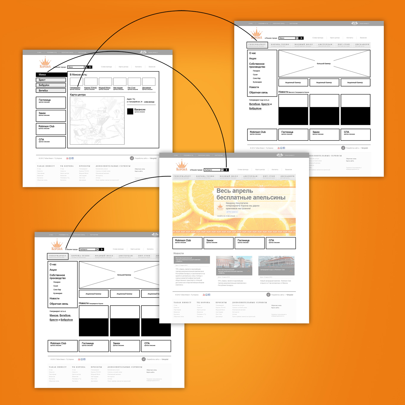Основной акцент сделан на акции и специальные предложения – им отведено место центрального баннера на каждой странице. Все другие объекты торгового центра представлены в виде разделов со своей структурой, новостями, акциями и предложениями.