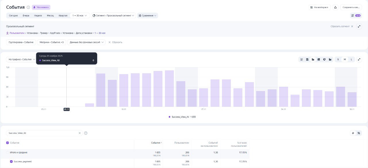 Вот, например, кампания, по которой в AppMetrica мы видим 205 пользователей: