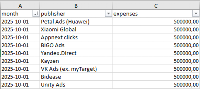 Во-вторых, мы можем анализировать эффективность партнёров. Тут нужно пояснить, что такое «партнёры с расходами». Мы загружаем в систему через Excel-файл данные о затратах каждого партнёра за прошедший месяц. Например, «январь | VK Ads | 1 000 000 ?». Система сама рассчитывает обороты и ROMI с установивших приложение через этот источник, показывая доходность по каждому месяцу. Это позволяет видеть среднее время окупаемости источника, рассчитывать ROMI и определять самые прибыльные источники.