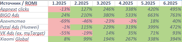 Система отображает окупаемость по месяцам отдельно для каждого партнёра (источника) в следующем формате: