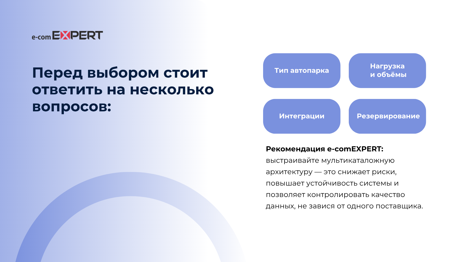 Рекомендация e-comEXPERT: выстраивайте мультикаталожную архитектуру — это снижает риски, повышает устойчивость системы и позволяет контролировать качество данных, не завися от одного поставщика.