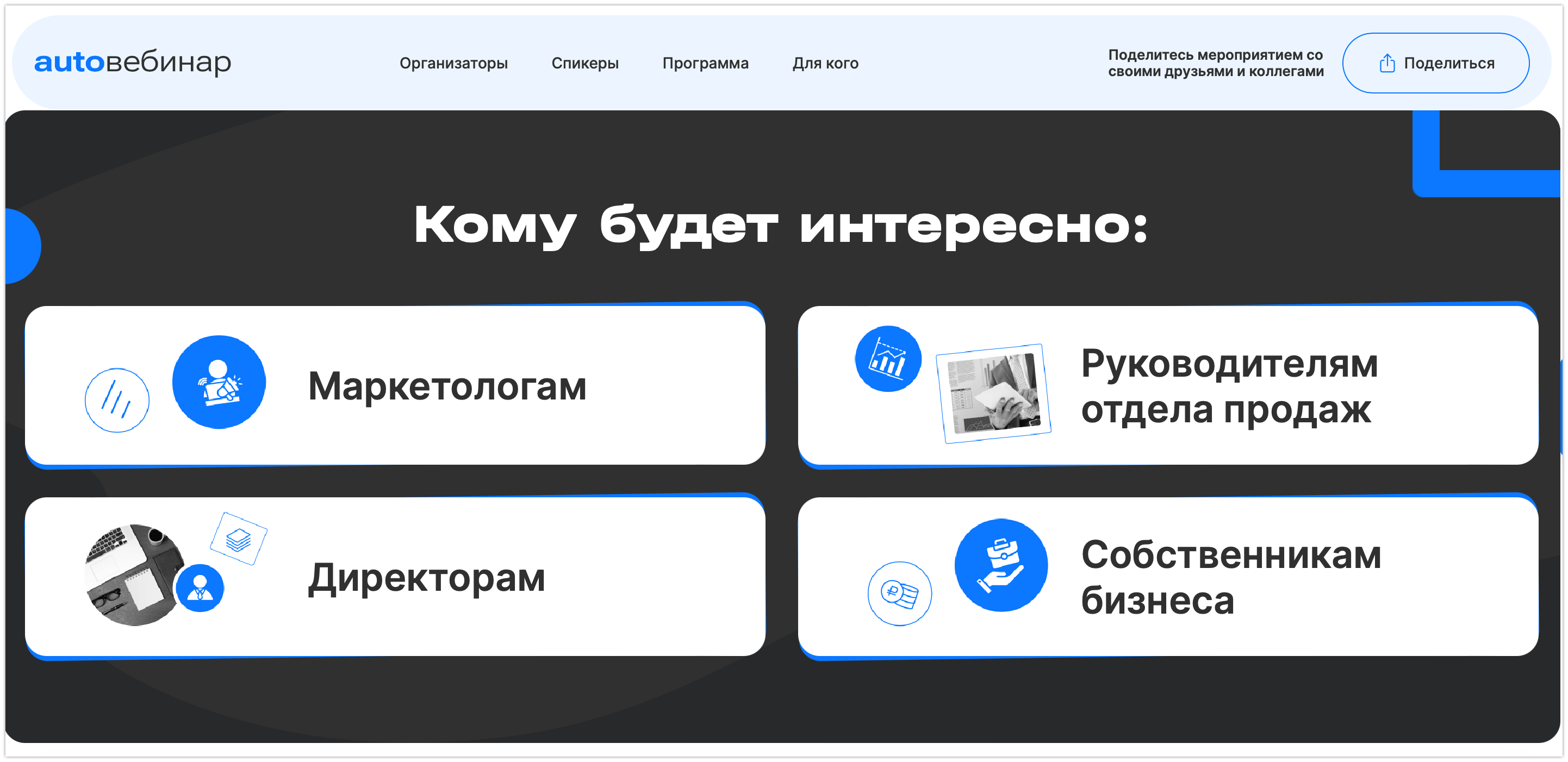 Опишите несколько целевых аудиторий, которым будет интересно поучаствовать в вебинаре. Когда потенциальный зритель зайдет на лендинг и узнает себя в описании, это будет для него дополнительным триггером, чтобы зарегистрироваться. Сделайте акцент на том, что темы, которые будут на вебинаре, зритель сможет потом обсудить с коллегами. Добавьте в этот блок атмосферы сообщества, клуба по интересам. Например, как это делают в описании некоторые Телеграм каналы — каждый 154 житель Омска подписан на этот канал.