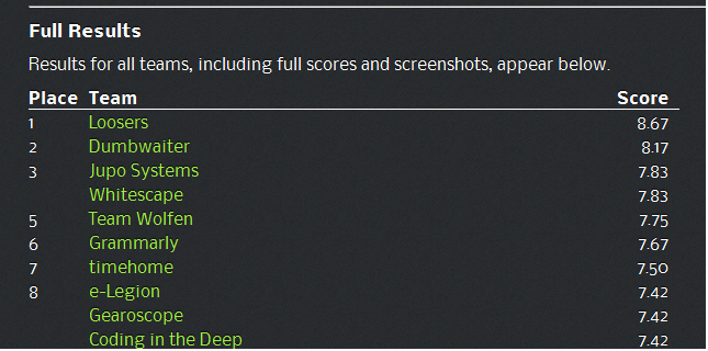 Совет жюри конкурса Django Dash, в состав которого входили главные разработчики Django Джефф Триплетт (Jeff Triplett), Дженнис Лайдель (Jannis Leidel) и Дэниэль Линдсли (Daniel Lindsley), оценил работу «Loosers» самым высоким итоговым баллом среди участников конкурса — 8,67 из 10. Ниже представлен скриншот со списком первой десятки лучших программистских команд.