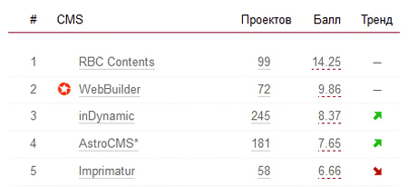 В ряду CMS, разработанных веб-студиями, верхние позиции сохранили за собой RBC Contents и WebBuilder (соответственно 1-е и 2-е места). Imprimatur в этот раз опустился с 3-го на 5-е место, пропустив вверх системы inDynamic и AstroCMS (3-е и 4-е места).
