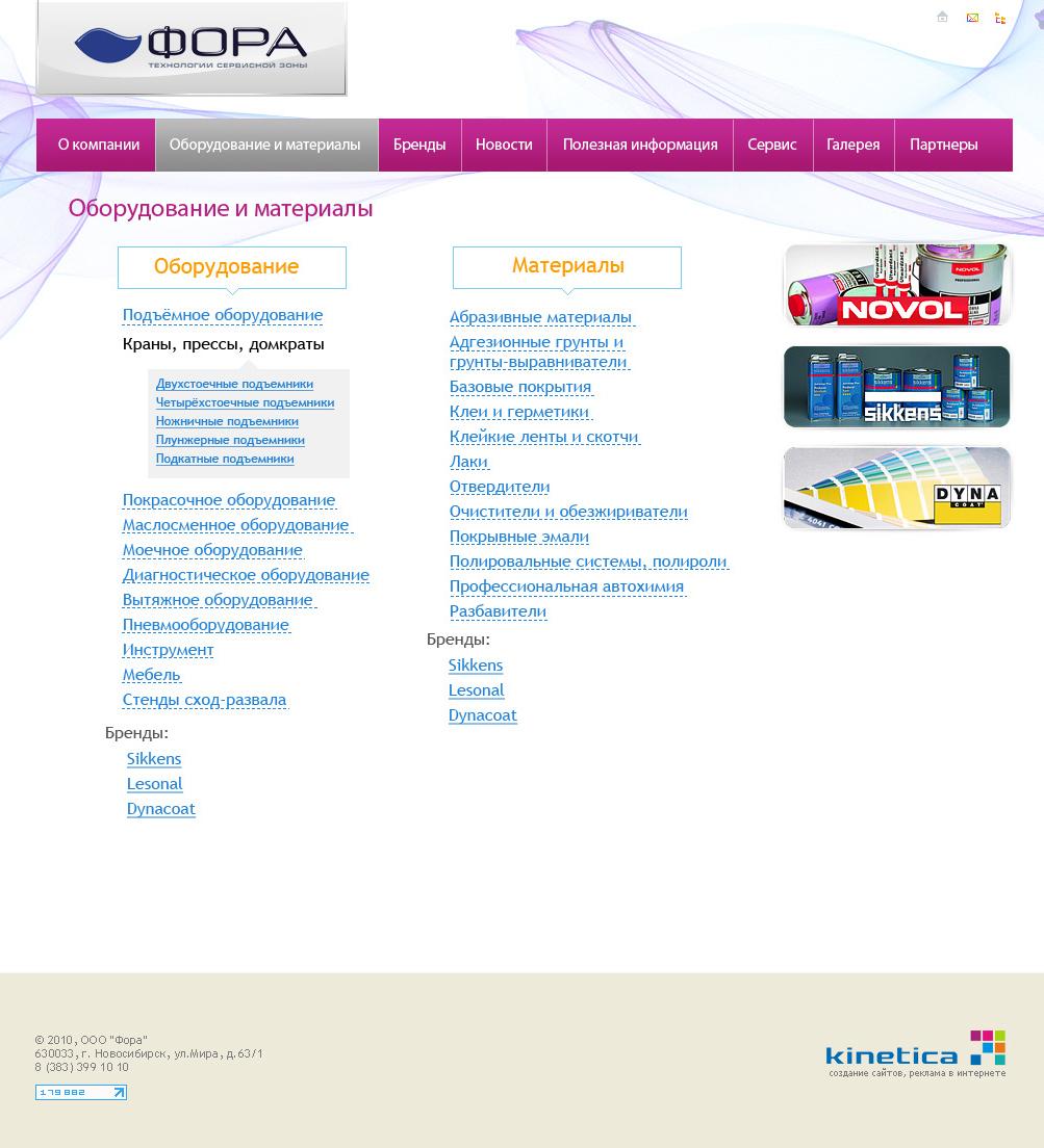 «ФОРА» — новосибирский поставщик оборудования и расходных материалов для автосервиса, и не только. Созданный в студии Kinetica дизайн нового корпоративного сайта www.for1.ru рассказывает о сфере деятельности компании, что называется, «в лоб!», а точнее — в лобовое стекло :-)