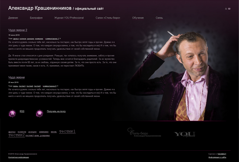 Александр Крашенинников. О чем думает стилист? На новом официальном сайте мысли профессионала о своей работе, о жизни и просто о себе. Информация о новых проектах и обучающих мастер-классах, все то, что интересно людям, работающим или пока только мечтающим работать в этой сфере.