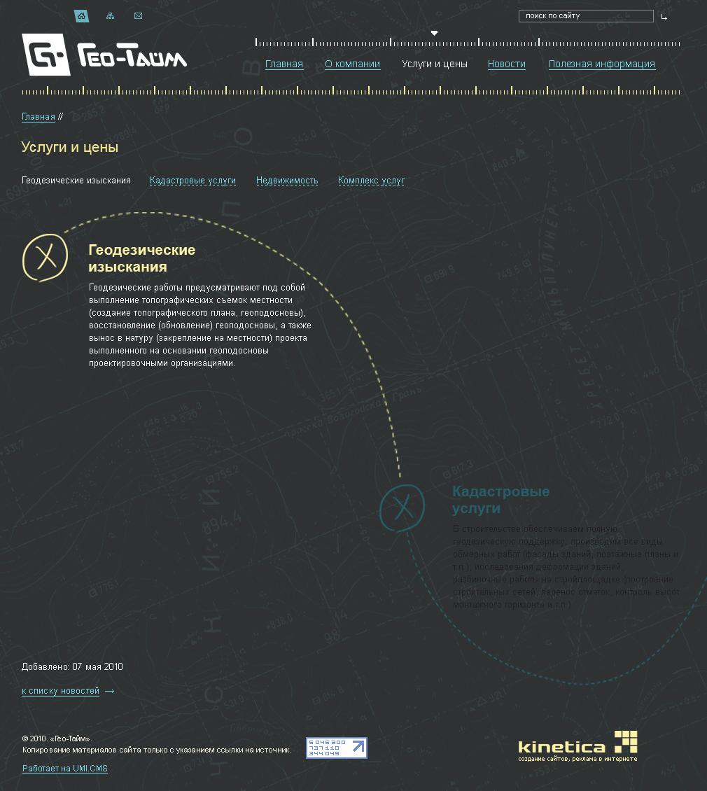 Для создания сайта в веб-студии Kinetica использовался популярный «коробочный движок» UMI.CMS, что позволяет сотрудникам компании «Гео-Тайм» заниматься наполнением и текущим обслуживанием корпоративного веб-ресурса самостоятельно после его сдачи разработчиками.