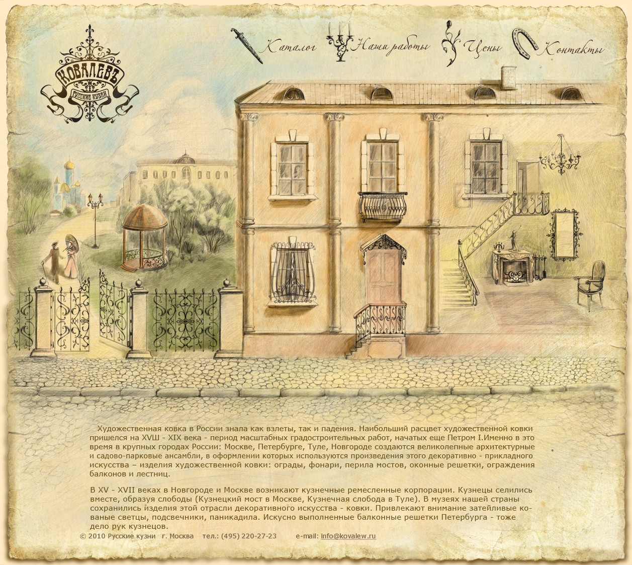 Кузнечное производство «КОВАЛЁВЪ» — это 10 цехов художественной ковки и собственное архитектурное бюро. В рамках проекта создания и развития нового кузнечного бренда в студии Kinetica был разработан дизайн логотипа и сайта, а также подобран созвучный домен www.kowalew.ru.