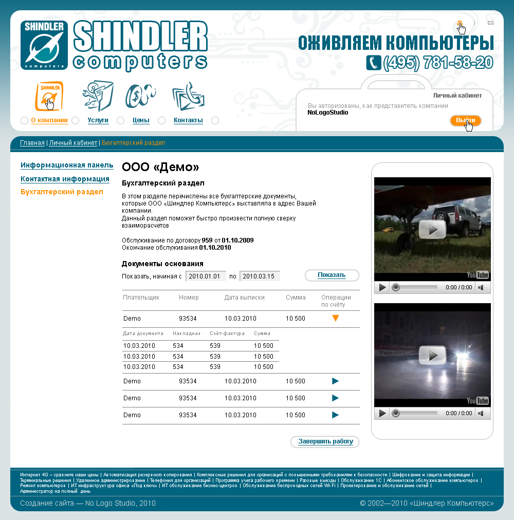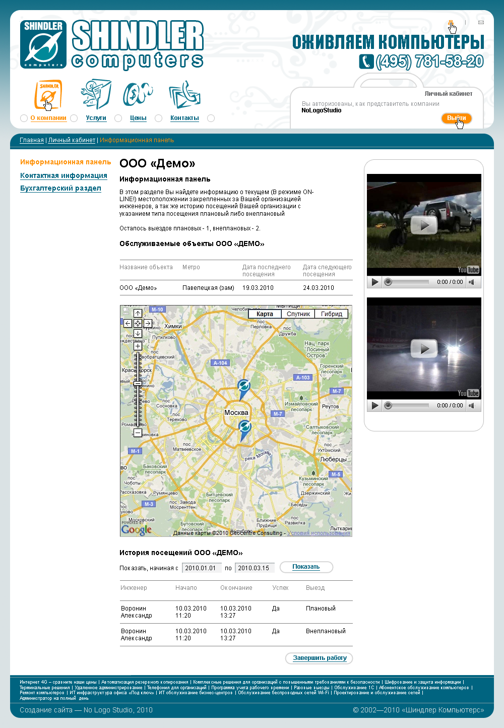 На сайте No Logo Studio так же реализовала личный кабинет с функциями документооборота, визуализации положения обслуживающиего персонала на карте Москвы (в реальном времени, SMS/GPRS), импорта/экспорта отчетности. Таким образом, сотрудники компании могут использовать новый сайт не только как рекламный инструмент и инструмент продаж, но и как удобное средство ведения своей основной деятельности.