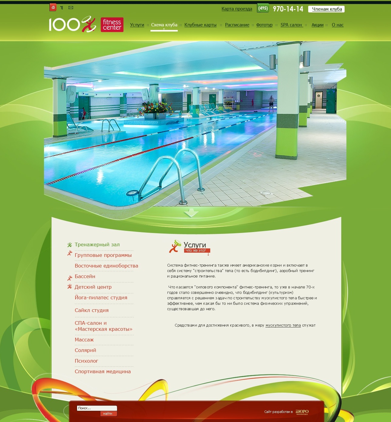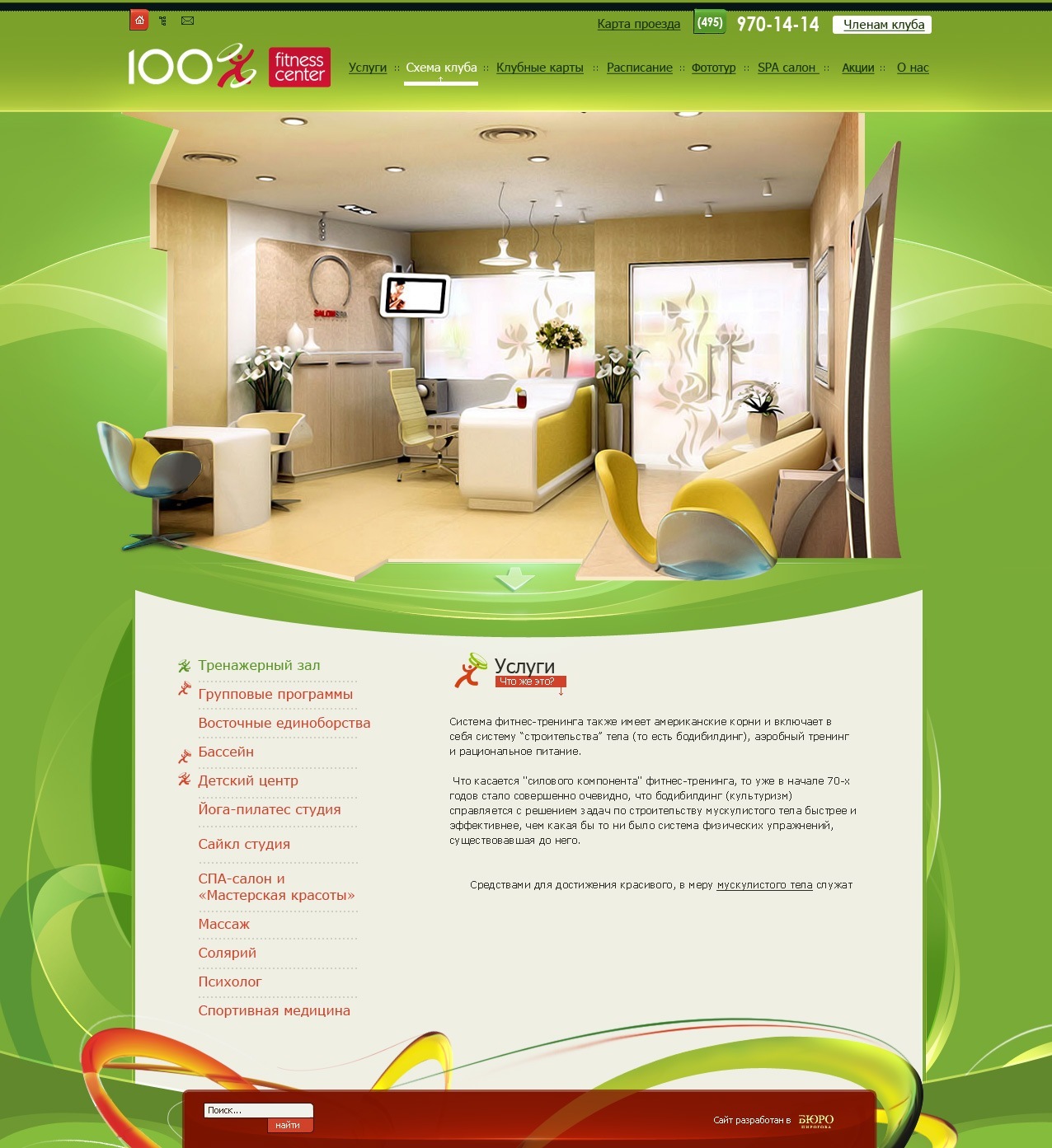 Всего было изготовлено более 20 страниц уникального дизайна с яркими информационными акцентами. В процессе разработки были использованы фотографии интерьера, выигрышно украшенные возможностями флеш-анимации и javascript. С функциональной точки зрения структура нового сайта детально продумана – у пользователей есть возможность подробно ознакомиться со всеми услугами фитнес-центра, для каждой из которых была разработана своя виртуальная комната. Кроме того, функционал сайта позволяет каждому члену клуба составить гибкий индивидуальный график занятий.