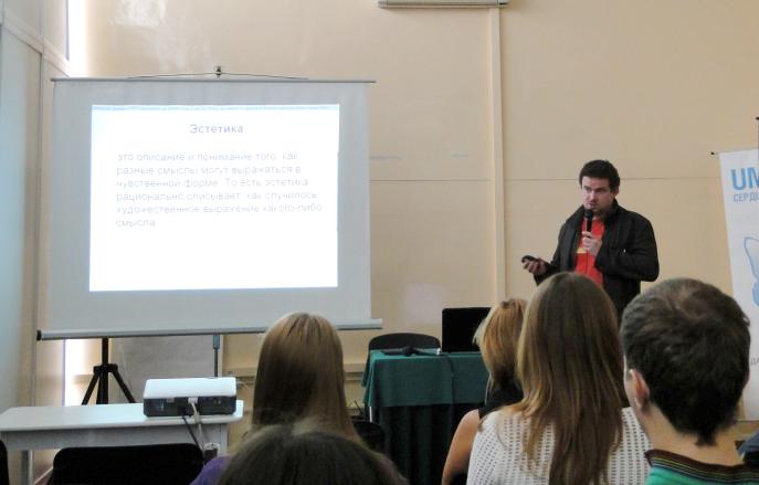 Креативный партнёр веб-студии KINETICA Денис Греков выступил с докладом «Прагматика и эстетика рекламного сообщения в дизайне»