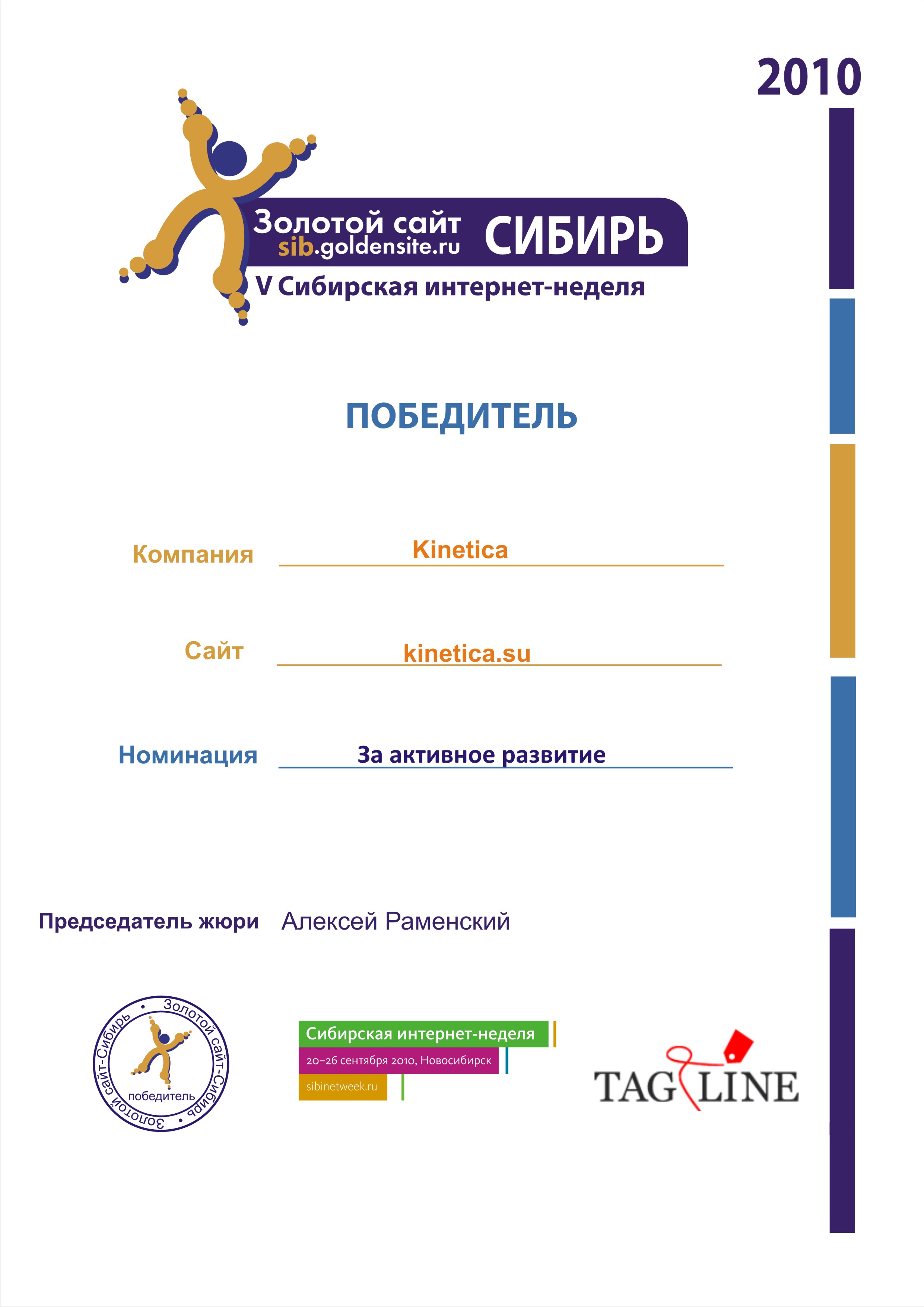 По итогам конкурса «Золотой сайт-Сибирь» успехи интернет-агентства KINETICA были отмечены 2-мя дипломами, один из которых был присуждён специальной номинации «За активное развитие», а второй — за корпоративный сайт www.geo-time.ru, разработанный на UMI.CMS.
