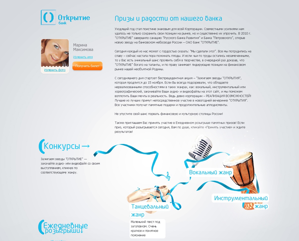Бюро Пирогова разработало новогодний промо-сайт, с помощью которого сотрудники банка «Открытие» могут принять участие в насыщенной корпоративной программе по случаю нового года. Он объединит на своих страницах десятки городов присутствия банка, ожидается регистрация более семи тысяч сотрудников. На базе данного сайта на данный момент проходит ежедневная лотерея и творческий конкурс «Зажигаем звезды «Открытия», где зарегистрированные пользователи смогут добавить аудио и видео- файлы с демонстрацией своих вокальных, хореографических и инструментальных способностей, а также проголосовать за понравившихся конкурсантов. Промо-сайт на данный момент является инструментом для развития корпоративной культуры, личностного роста и развития сотрудников Банка.