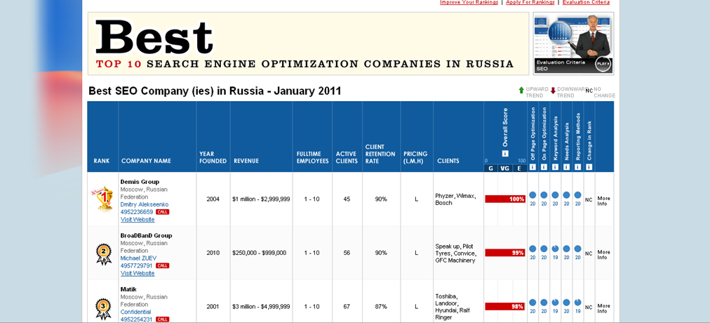 Десятка российских SEO-лидеров по версии TOPSEOs выглядит так: 1.Demis Group, 2.BroaDBanD Group (Корпорация РБС), 3.Matik, 4.I-Media, 5.Trilan, 6.Techart , 7.Vipro, 8.Promodo, 9.Seo Complex, 10.Trinet.
