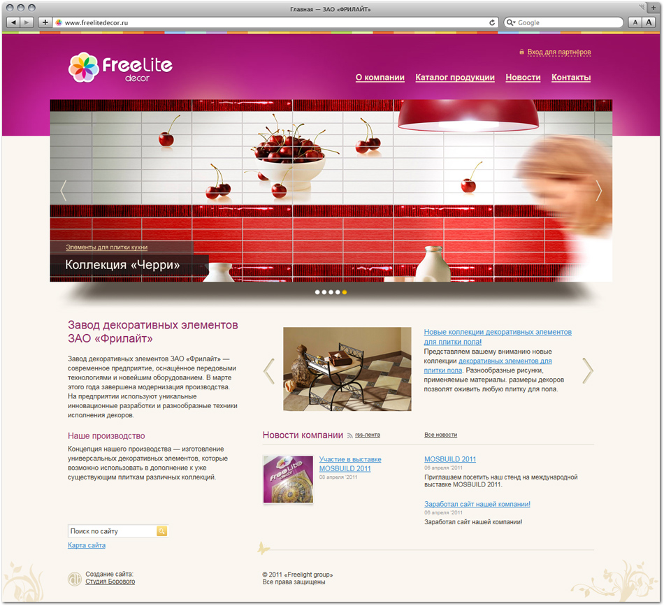 Для компании «Фрилайт» мы разработали информационный сайт со сменяющимися иллюстрациями в промо-блоке (слайдере) на титульной странице. Коллекции декоративных элементов представлены в удобном каталоге продукции. По каждой коллекции пользователь может просмотреть виды и размеры декоративных вставок, технические характеристики и примеры использования в интерьере.