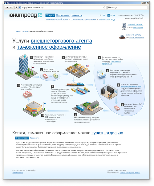 Люди приходят в компанию «Юнитрейд» и просят сделать за них всю работу, связанную с импортом товаров в Россию и экспортом товаров в другие страны. Для решения этих задач, «Юнитрейд» разработал специальные схемы работы, а в артели придумали, как эти схемы просто и наглядно донести до посетителей сайта при помощи инфографики.
