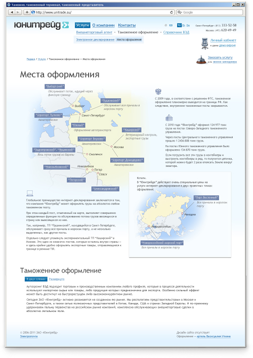 Помимо комплексных решений, связанных с импортом и экспортом, компания предлагает своим клиентам самостоятельную услугу электронного декларирования товаров на таможне. Таможенные посты, с которыми работает «Юнитрейд», закрывают все основные маршруты, по которым товары попадают в Россию и покидают ее.