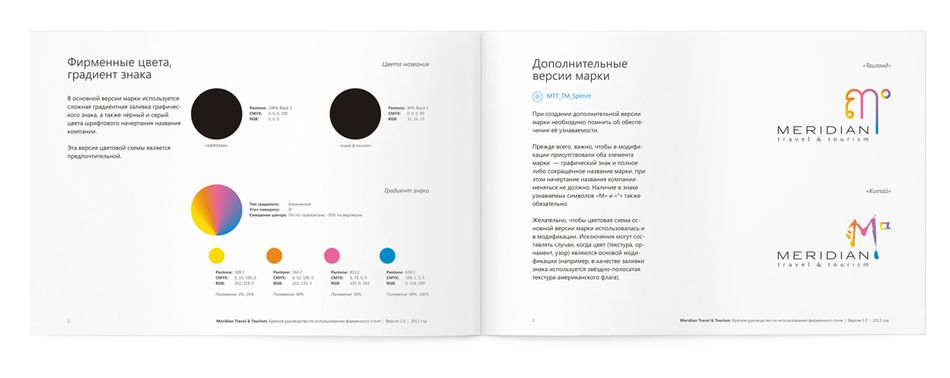 К четкому графическому названию был добавлен радужный символ, который преобразил строгое начертание и привнес ощущение радости, моря новых открытий и лучезарных эмоций. Символ «М°» легко меняет свою форму от готического стиля, который актуален для анонсирования туров по странам Центральной Европы, до арабской вязи, презентующей сказочный отдых в Эмиратах.