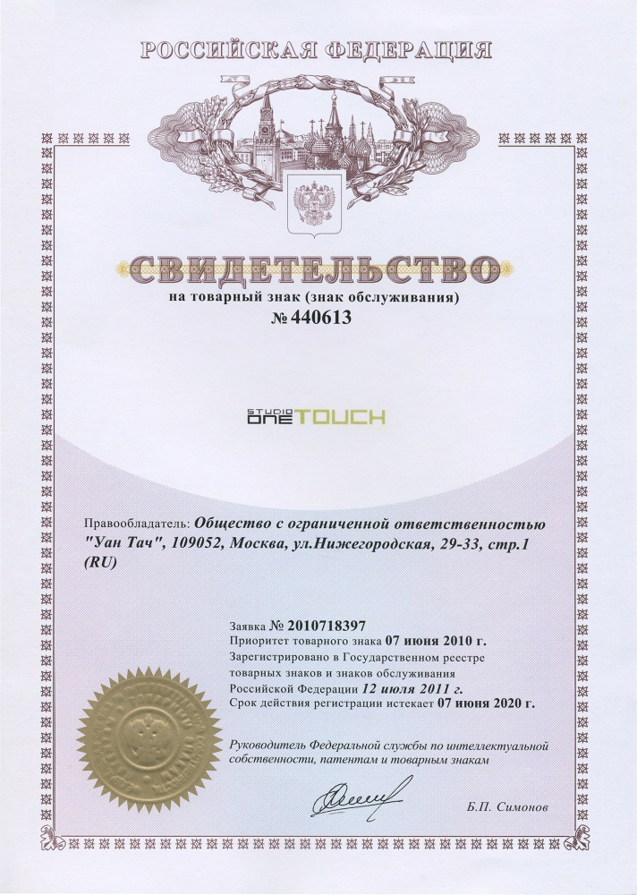 Теперь студия является исключительным правообладателем данного товарного знака. Это означает, что никто не может без разрешения Studio oneTOUCH использовать товарный знак или схожее с ним до степени смешения обозначение в отношении предоставляемых услуг, указанных в свидетельстве.