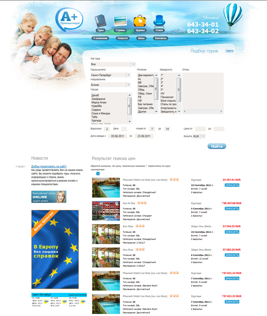 Креативное агентство «Other Side» завершило работу над сайтом туристической компании «A+» (http://www.aplustour.ru). Сайт обладает приятным дизайном и широким набором функций. Проект был реализован на CMS «1С-Битрикс» с импортированным модулем бронирования. Специально для этого проекта был модифицирован стандартный фильтр поиска туров, которые используют туристичекие компании, а также разработали дополнительный модуль. Это позволило создать систему импорта с различных сервисов для создания собственной базы компании «A+».