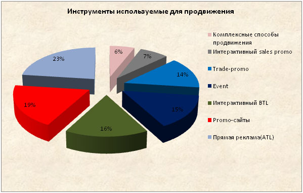 На представленной выше диаграмме видно, что 23% опрошенных используют прямую рекламу, как основной инструмент продвижения, и только 6% - комплексные способы продвижения, например (web+mobile+BTL).