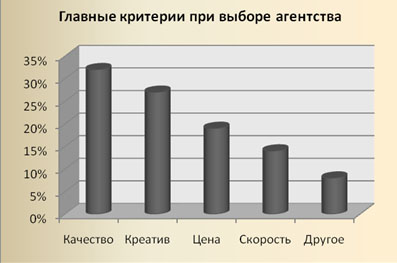 Самые развернутые ответы были получены на вопрос о критериях выбора агентства-подрядчика, где, в первую очередь, отметили качество оказываемых услуг. Также важным фактором выбора являются креативные идеи и концепты. Ценовую политику и скорость подчеркнули от 15 до 20% компаний. Среди прочего респонденты указывали: хороший менеджмент, репутацию агентства, опыт прошлого сотрудничества, организованность, сервис, ориентированность на клиента и умение вести проект от начала и до конца