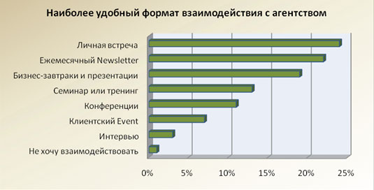 Самым удобным и востребованным средством взаимодействия по-прежнему является личная встреча. С небольшим отрывом в процентном соотношении выбирают ежемесячный newsletter, бизнес-завтраки и презентации, а также семинар или тренинг. Опрос выявил 7% желающих посещать клиентские мероприятия, 3% готовы пройти интервью.