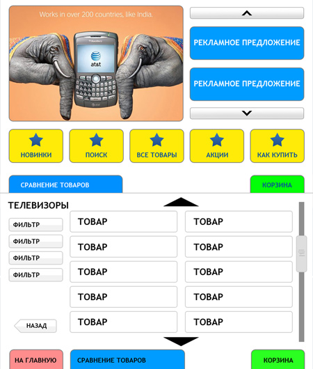 – Создать электронный каталог для использования в терминалах с сенсорным управлением, который позволял бы представить обширный ассортимент продукции даже в небольшой точке продаж, а также совершить покупку, не отходя от терминала.