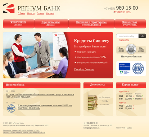 В конце 2011 года специалисты студии Armexdesign закончили еще один проект: заказчику был сдан корпоративный сайт коммерческого банка «Регнум Банк».