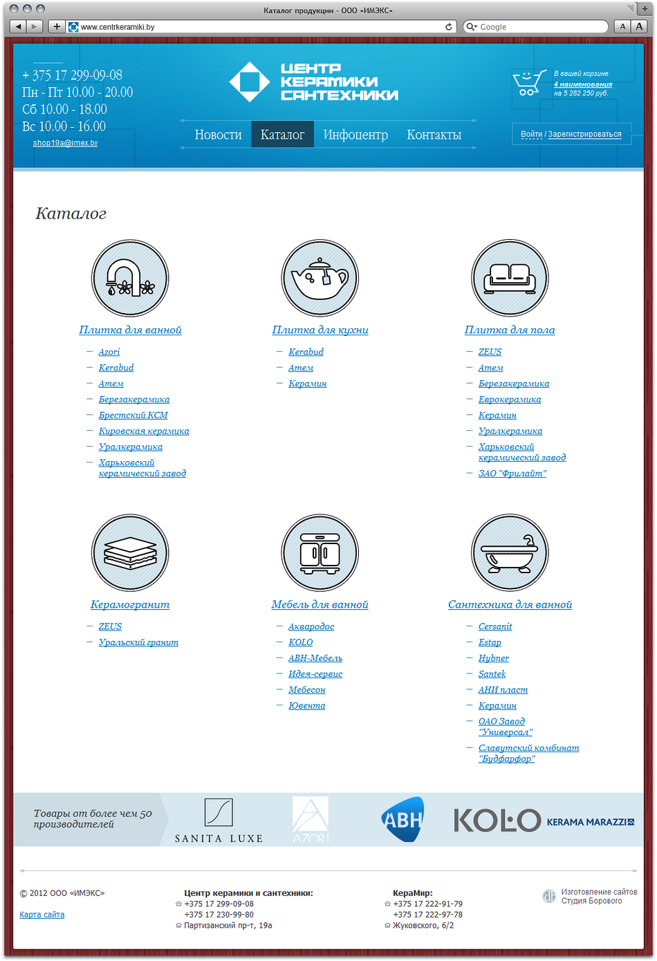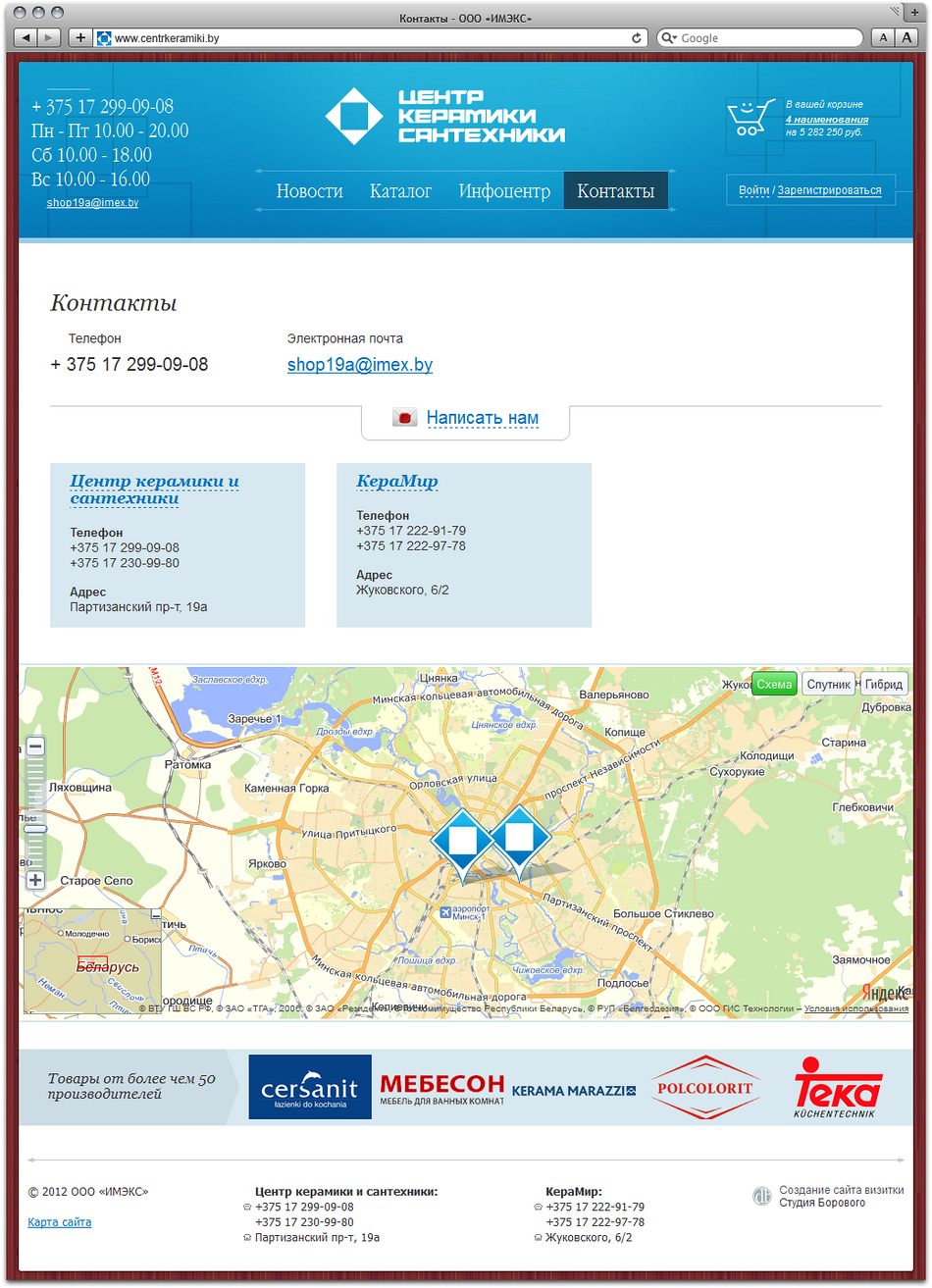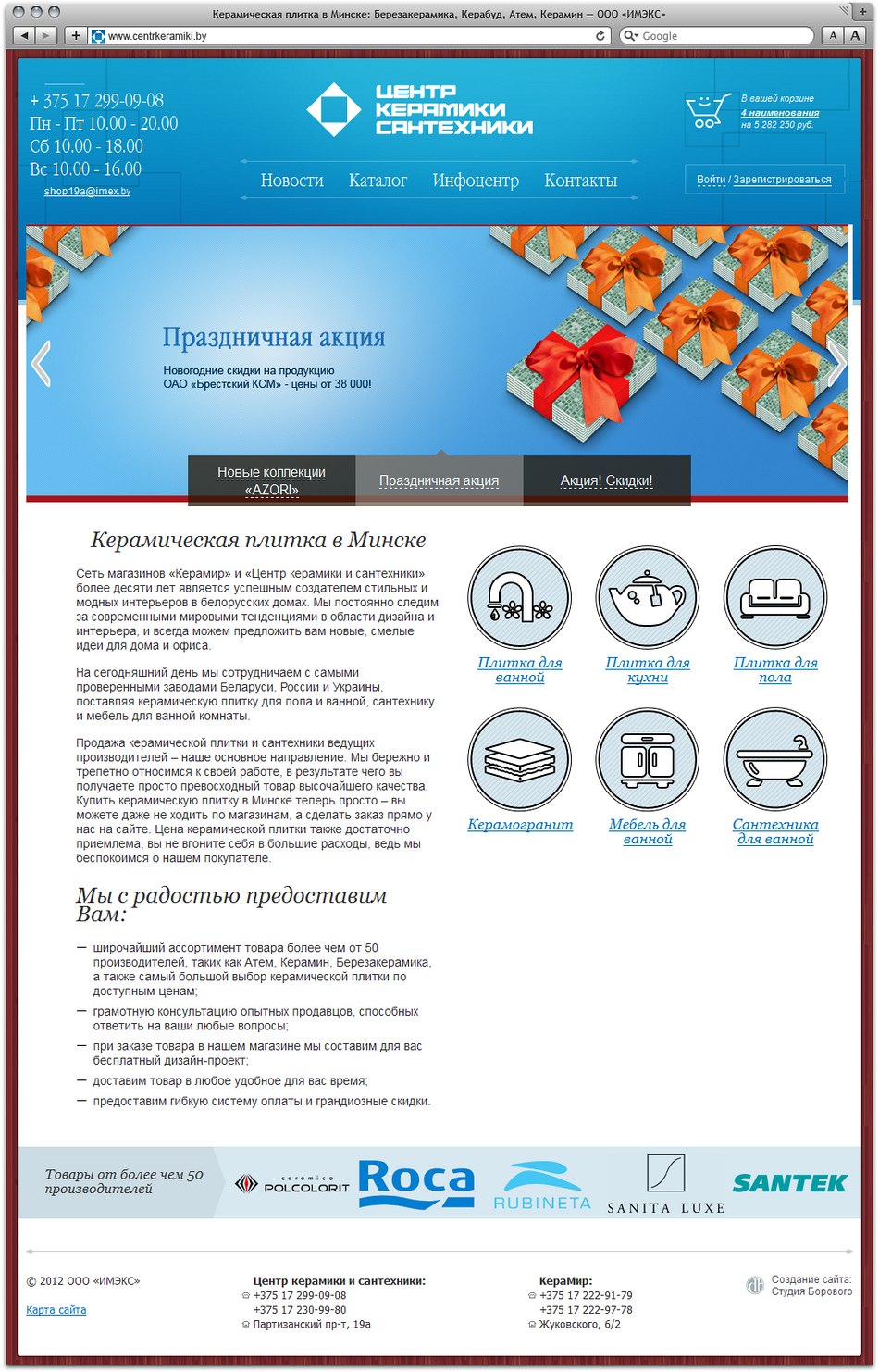 Студия Борового представляет интернет-магазин cети магазинов «Керамир» и «Центр керамики и сантехники» компании «Имэкс», предлагающий широкий выбор керамической плитки, сантехники и мебели для ванной от более чем 50 производителей.