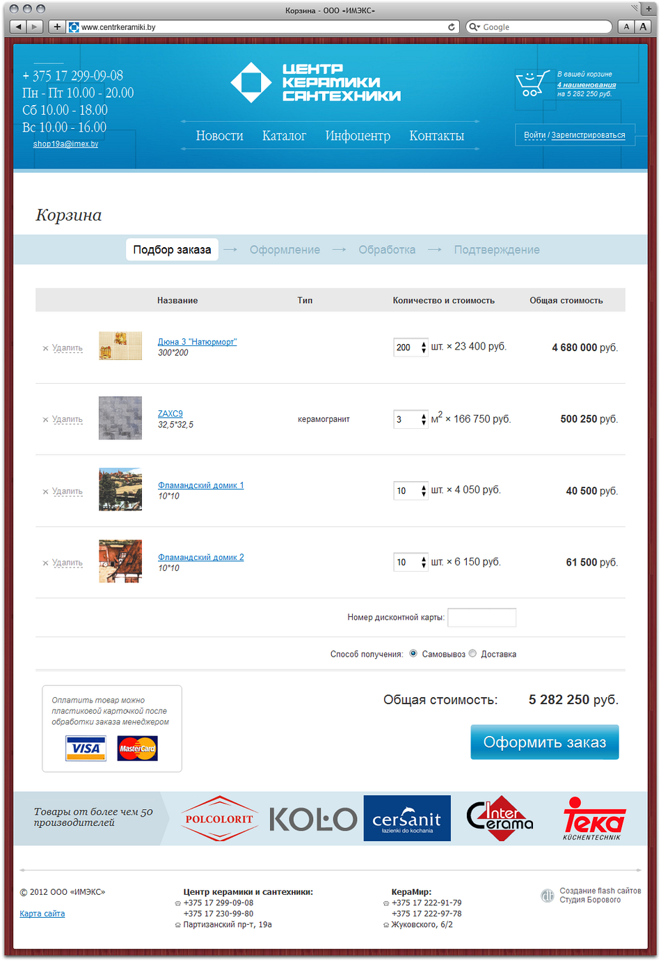 На странице Корзины вы можете вновь просмотреть выбранные вами товары, уточнить необходимое их количество и конечную стоимость, указать желаемый способ доставки. Держателям дисконтных карт предлагается ввести свой персональный код.