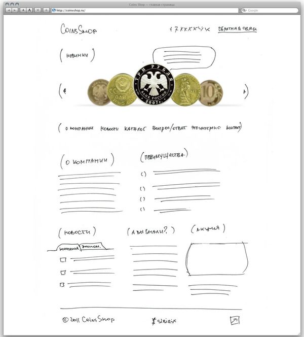 На скетче каталог носит «рабочее» имя CoinsShop. Итак, мы имеем пока очень смутный образ, который будет постепенно наполняться красками.