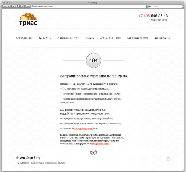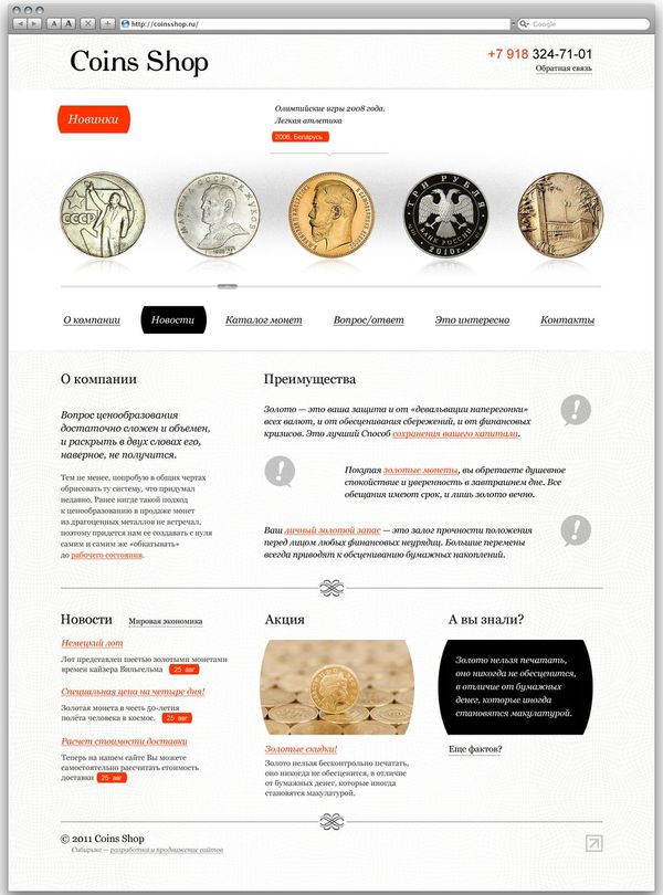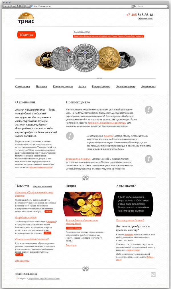 Задача: Разработать сайт на системе управления 1С-Битрикс редакции «Малый бизнес» с такими возможностями: парсинг новостей с finam.ru, детальная фильтрация каталога по двадцати параметрам, формами заказа монеты и обратной связи. А также чтобы всю «сокровищницу» можно было просматривать как в виде каталога, так и зайдя на страничку конкретной монеты с крупными превью и всевозможными её характеристиками: металл, проба, масса, качество чеканки, тираж и т.д.