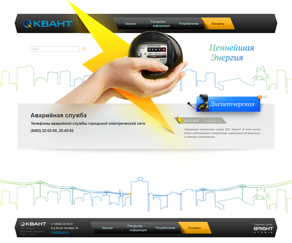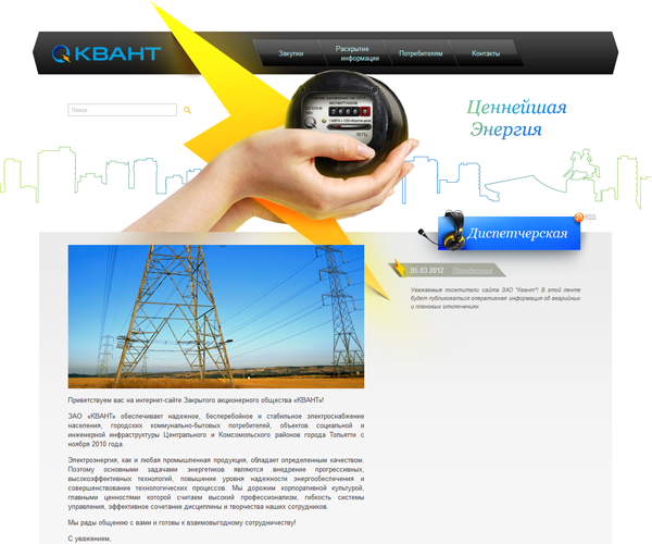 В своей работе дизайнеры отталкивались от ранее разработанного логотипа компании. Один из его элементов – молния, символ энергии, был использован в графическом оформлении сайта и задал общую диагональную динамику всех элементов оформления страниц. Стильным и оригинальным получился дизайн меню с выпадающими под углом разделами.