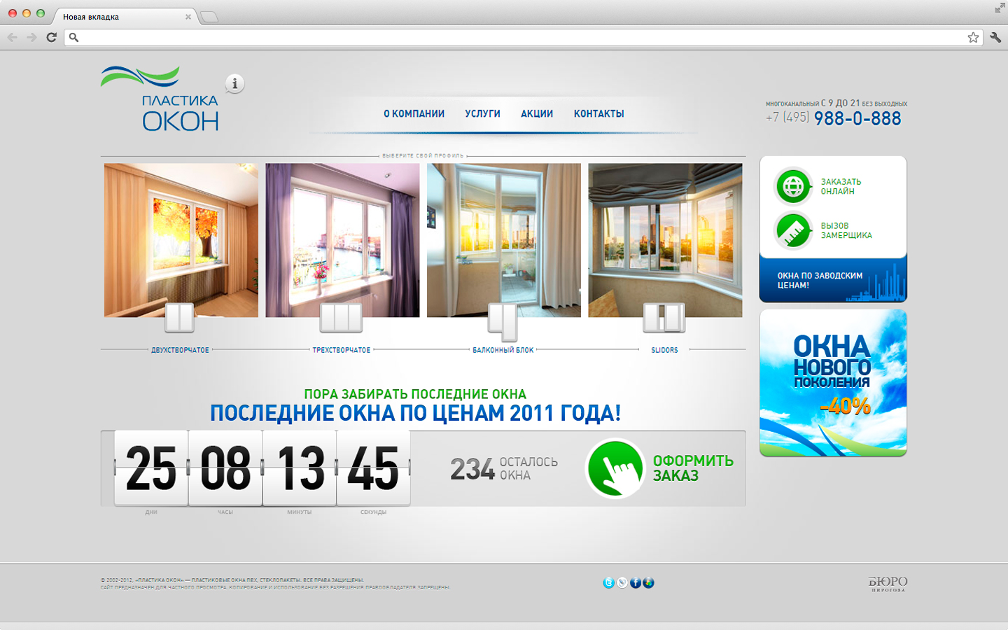 Здесь мы видим, что сайт занимает все пространство экрана и не выходит за его границы. Все разделы сайта всегда находятся в поле видимости пользователя. В центральном блоке в ряд расположены 4 основных раздела продукции компании, справа – баннеры оформления заказа и промо-страницы, ниже – баннер промо-акции с таймером обратного отсчета.
