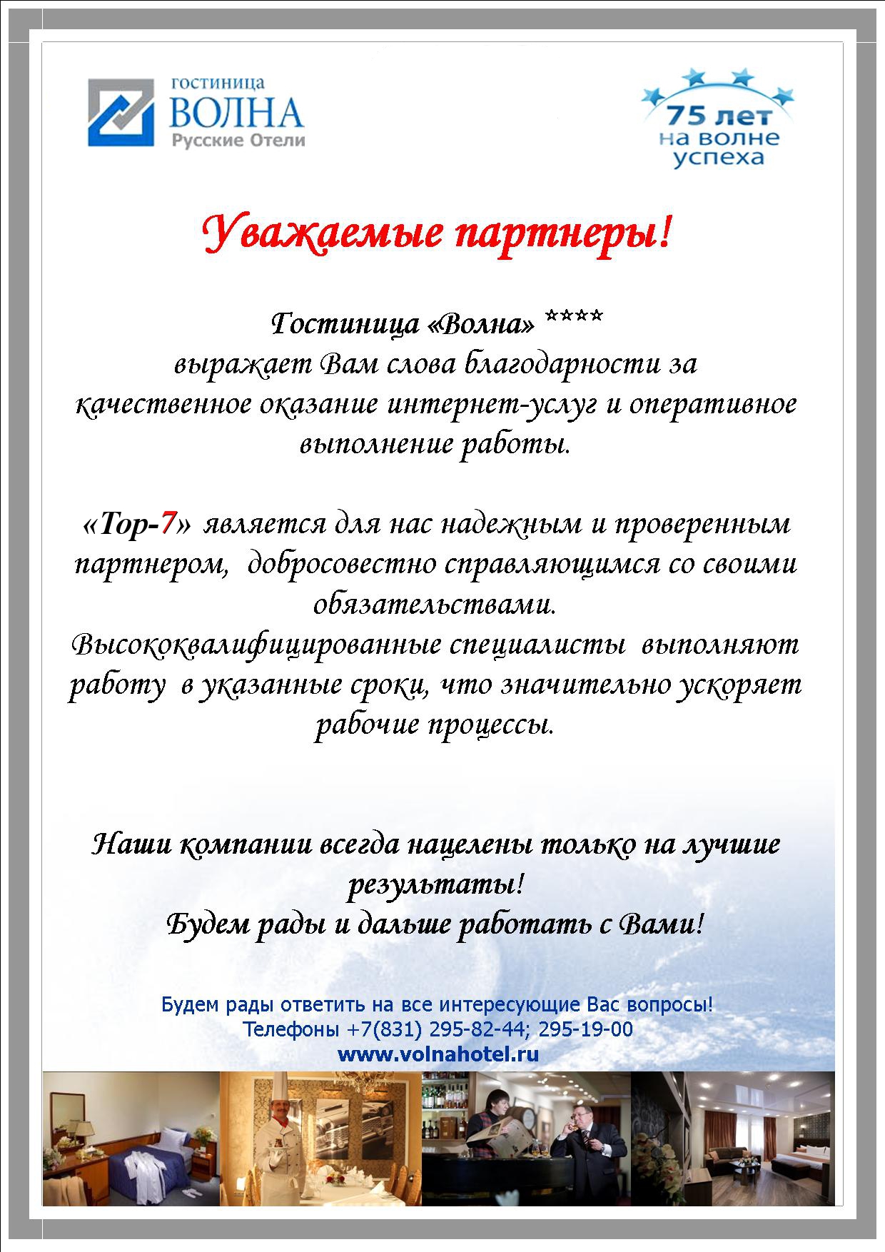 Приятные новости. Компания Top-7 и крупнейшая гостиница Нижнего Новгорода "Волна" теперь партнеры