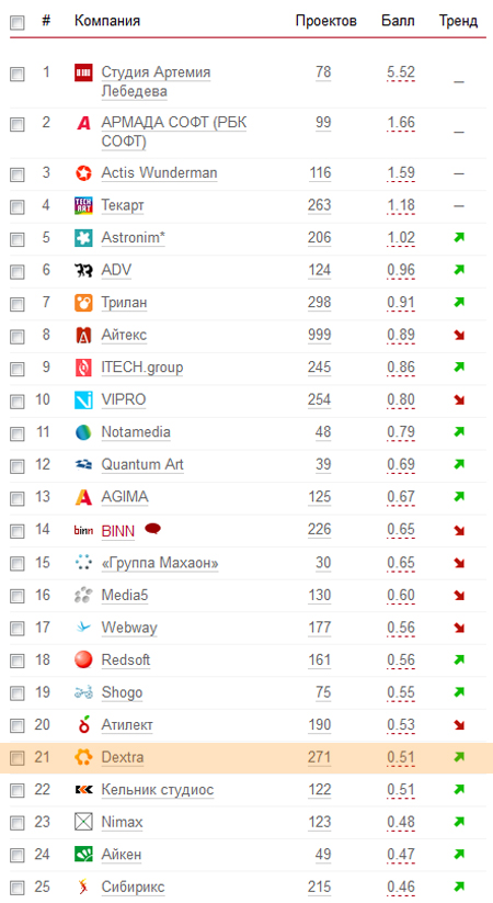 Проект «Рейтинг Рунета» подвёл итоги ежегодного рейтинга ведущих веб-студий. Интернет-агентство Dextra поднялось ещё на одну позицию – теперь мы на 21-ой позиции среди 4886 веб-студий страны, принимавших участие в рейтинге.