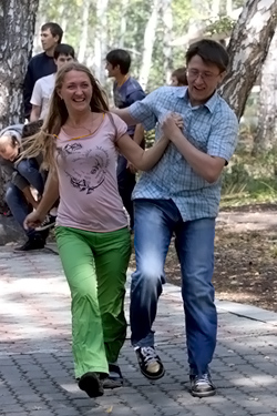 Не теряя времени, сразу после официального поздравления и вручения медалей мы перешли к самой массовой и активной части программы – эстафете! Те, кто по «медотводу» надеялся избежать участия в этом действе, стали капитанами команд – и надо сказать эмоций и переживаний за свою команду испытали не меньше, чем остальные, которым приходилось бегать и прыгать, выполняя причудливые задания. В парах, паровозиком, боком или со связанными ногами – участники эстафеты дружно бежали к своим капитанам (и обратно).