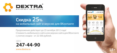 Напомним, до 25 октября 2012 года интернет-агентство Dextra предлагает разработку мобильного сайта или версии для ВКонтакте со скидкой 25%.