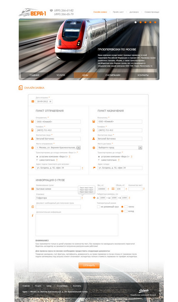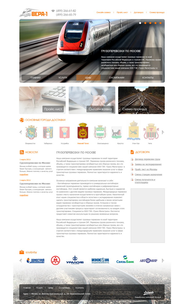 Транспортная компания «Вера 1» была создана в 1995 году и уже более 15 лет занимается грузоперевозками во многие города России. Основным приоритетом является доставка малогабаритных грузов, почты, багажа из Москвы, Санкт-Петербурга в такие удаленные точки, как Хабаровск, Владивосток, Иркутск, Чита. Для того чтобы расширить клиентскую сеть, прорекламировать свои услуги во всемирной паутине, руководство компании приняло решение разработать качественный сайт. В роли исполнителя была выбрана компания «ЮниВеб».