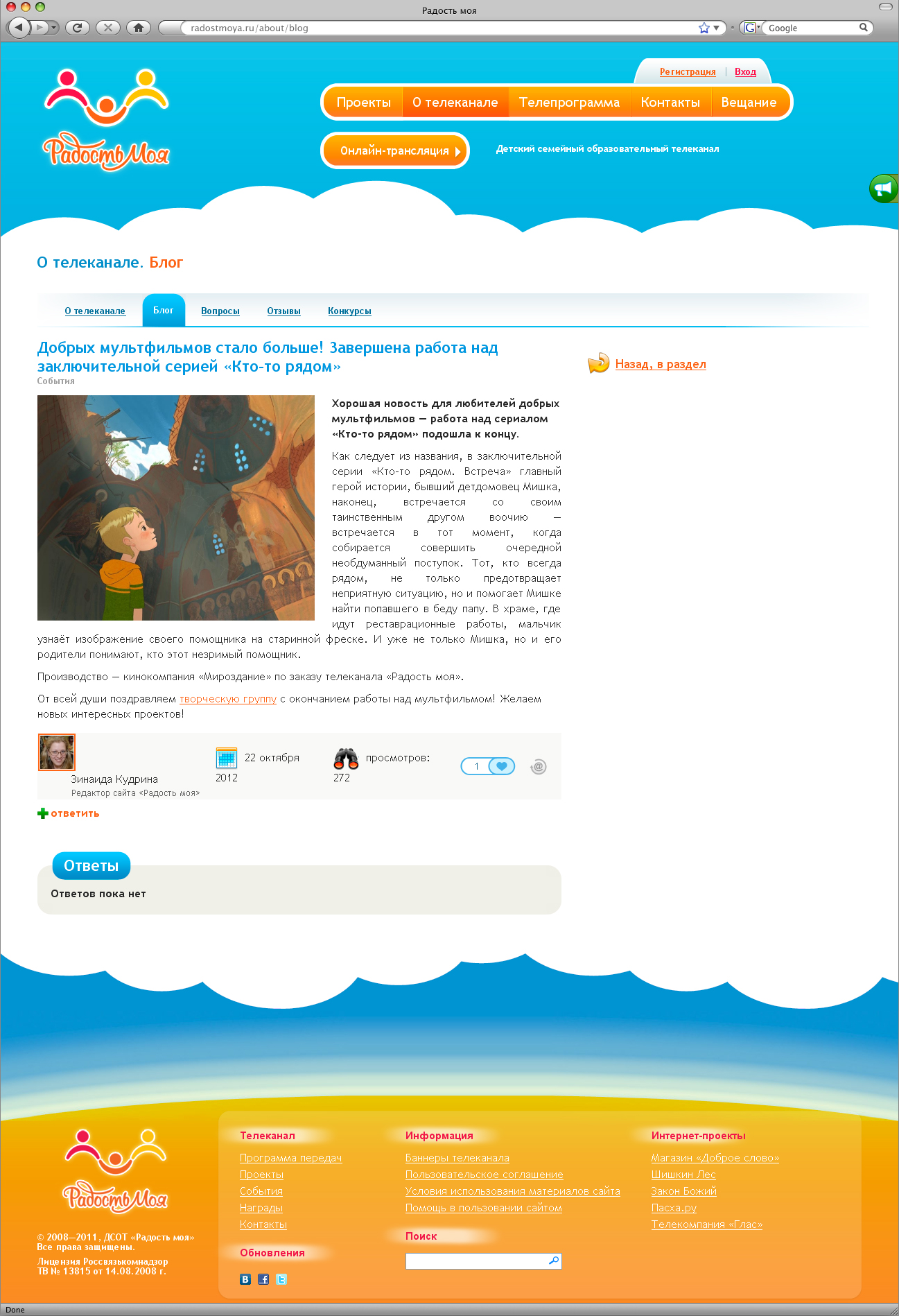 Постоянный рост числа телезрителей привёл к расширению аудитории сайта www.radostmoya.ru, выросли и требования к его обслуживанию. Редакции потребовались существенные улучшения административной панели и дополнительная функциональность сайта. Количество посетителей постоянно и стабильно растёт, поэтому было крайне важно повысить быстродействие и отказоустойчивость ресурса.