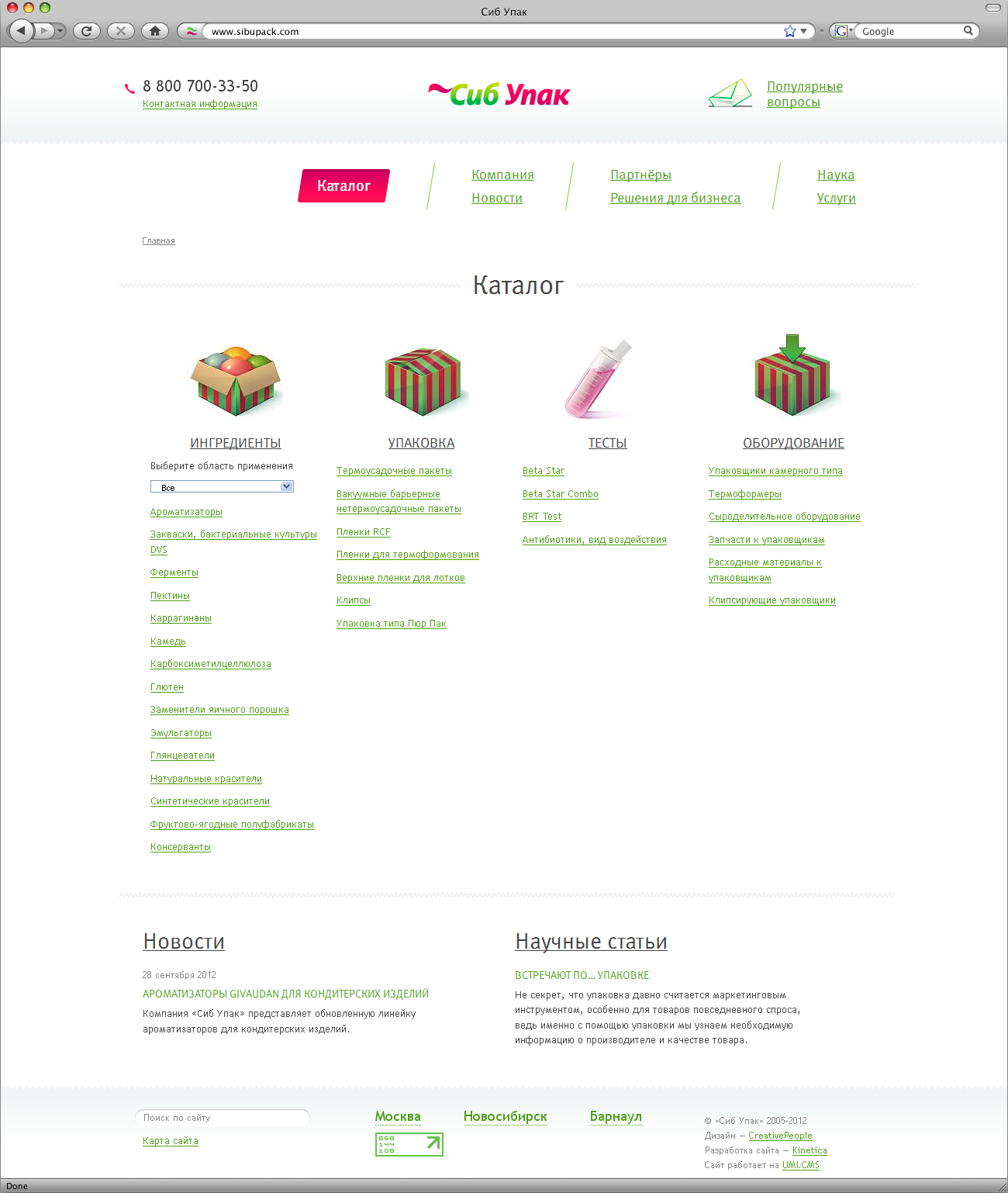 Во многом благодаря прогрессивным взглядам «Сиб Упака», в 2007 году была создана KINETICA — на тот момент просто подразделение для продвижения интересов компании и её партнёров в интернете. Со временем KINETICA обрела самостоятельность, но глубокое понимание маркетинговых задач «Сиб Упака» осталось с нами. Когда речь пошла об очередном редизайне сайта www.sibupack.com, мы смогли поставить правильный диагноз: клиенту нужен не только новый визуальный ряд, но и обновлённое позиционирование бренда.