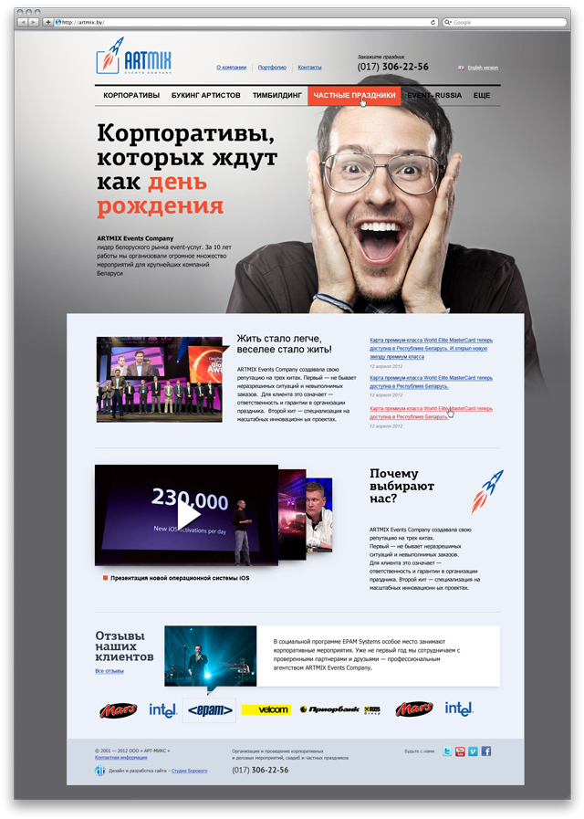 ARTMIX Events Company – это 11 лет успешной работы на рынке организации корпоративных мероприятий. Это сотни праздников и семинаров, концертов и шоу-программ, конференций, презентаций и рекламных акций.