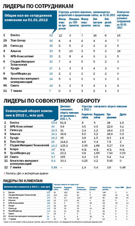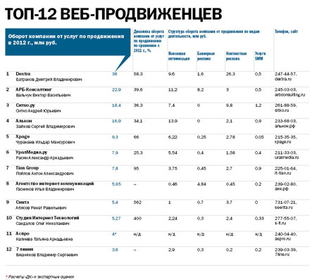 Показав хорошую динамику в 58% по сравнению с 2011 годом, мы заняли первую позицию в рейтинге по обороту компании от услуг поисковой оптимизации, размещения баннерной и контекстной рекламы, услуг SMS. Общий оборот компании Dextra в 2012 году составил 38 млн. рублей.