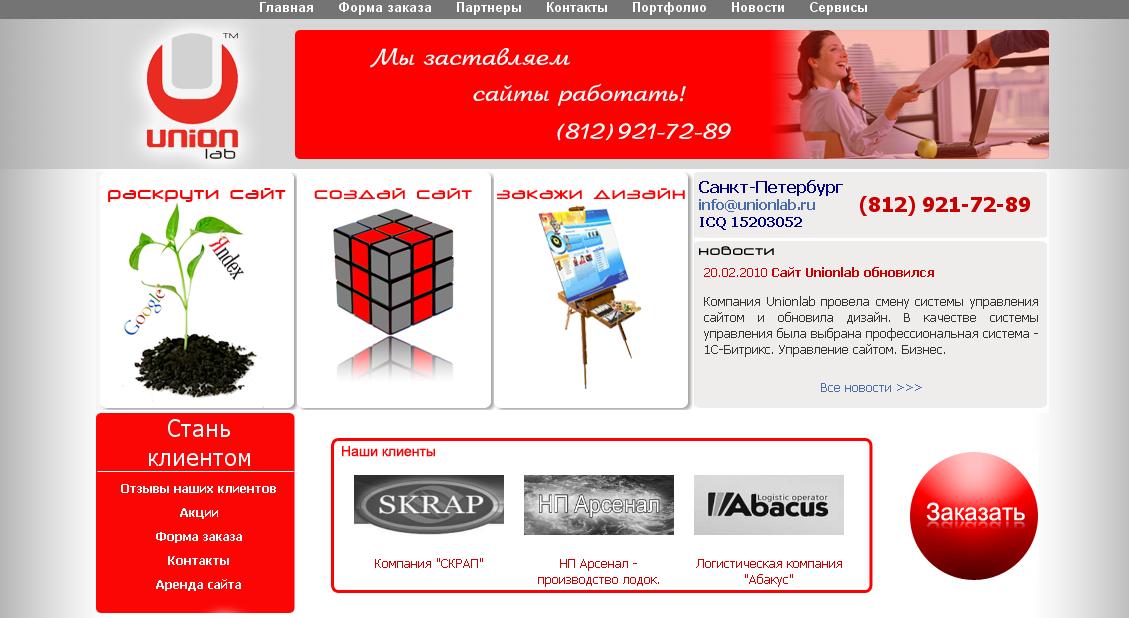 Компания Unionlab, провела смену системы управления сайтом и обновила дизайн сайта. В качестве системы управления была выбрана профессиональная система для создания и управления интернет-проектами - 1С-Битрикс. Управление сайтом. Бизнес, разработанная стратегическим партнером компании. Дизайн сайта стал более современным и полностью ориентирован на привлечение клиентов. Визуально выделены основные оказываемые услуги и всегда перед глазами контактная информация и возможность быстрого перехода к форме заказа. Все on-line заказы в форме заказа сохраняются в системе и дублируются на почту, таким образом ни одна заявка не останется без рассмотрения.