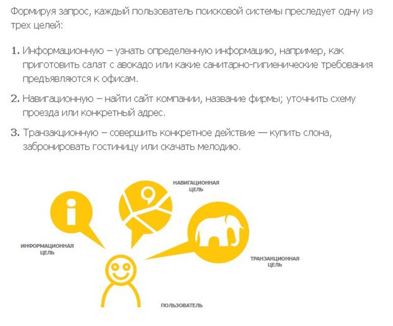 В первом пункте книги рассказывается о том, что такое поисковые системы, каковы особенности их работы и т.п. Также в пункте дана классификация поисковых запросов: