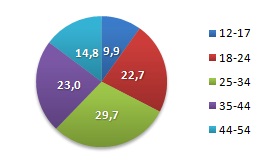 По данным TNS с 15 по 21 ноября доля женщин в аудитории Моего Мира составила 52,3%, а мужчин 47,7% - наблюдаем гендерный паритет. При этом ядро аудитории практически равномерно распределено по возрастам с 18 до 44 лет: